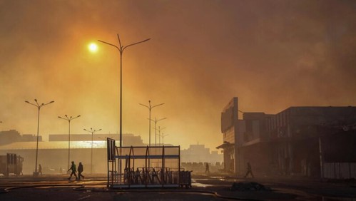 Lính cứu hỏa chữa cháy tại một siêu thị ở Kharkiv bị Nga oanh kích vào ngày thứ Bảy 25/05/2024, lúc có nhiều người dân đi mua sắm. Reuters - Oleksandr Ratushniak