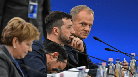Tổng thống Ukraine Volodymyr Zelensky và thủ tướng Ba Lan Donald Tusk dự Hội nghị thượng đỉnh Cộng đồng Chính trị Châu Âu tại Puskas Arena, Budapest, Hungary, ngày 07/11/2024. Reuters - Marton Monus