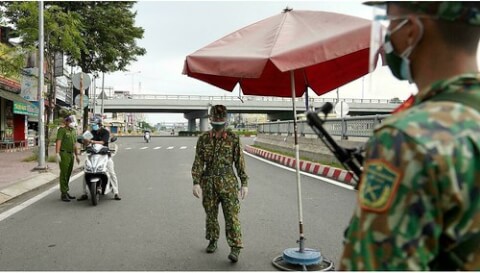 Quân đội tham gia kiểm soát tại một chốt chặn ở Sài Gòn, ngày 23/08/2021. AFP – Pham Tho