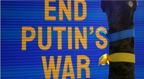 Thông điệp của người biểu tình trước trụ sở Liên Hiệp Quốc ở New York (Hoa Kỳ), "Chấm dứt cuộc chiến của Putin". Đại Hội Đồng Liên Hiệp Quốc họp khẩn về sự kiện Nga xâm lược Ukraine, ngày 28/02/2022. Reuters – Mike Segar