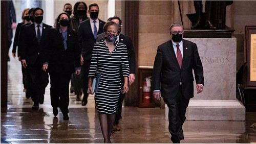 Đoàn đại diện của Hạ Viện Hoa Kỳ chuyển cáo trạng luận tội phế truất cựu tổng thống Donald Trump sang Thượng Viện, Washington, ngày 25/01/2021. Reuters – Alexander Drago