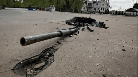 Tháp pháo một chiếc xe tăng Nga bị phá hủy dính chặt dưới mặt đường ở Zalissia, ngoại ô Kiev, Ukraine ngày 03/05/2022. Reuters - Zohra Bensemra