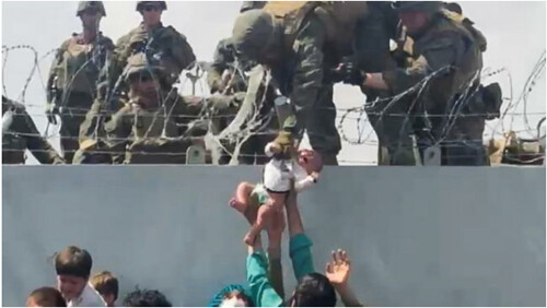Một em bé được người thân không thể di tản giao phó cho lính Mỹ qua bức tường kẽm gai ở phi trường Kabul, Afghanistan ngày 19/08/2021. Ảnh cắt từ video trên mạng xã hội via Reuters – Omar Haidari