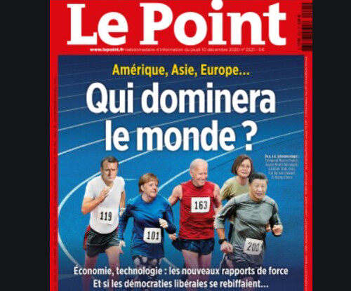 Trang bìa tuần báo cánh hữu đăng hình vẽ các "vận động viên" trên đường chạy : Macron, Merkel, Biden, trong đó Tập Cận Bình vượt lên trước đôi chút và ngạc nhiên thay, có cả bà Thái Anh Văn phía sau. Theo Le Point, tương quan lực lượng trong thời đại mới là ở lãnh vực kinh tế và công nghệ.