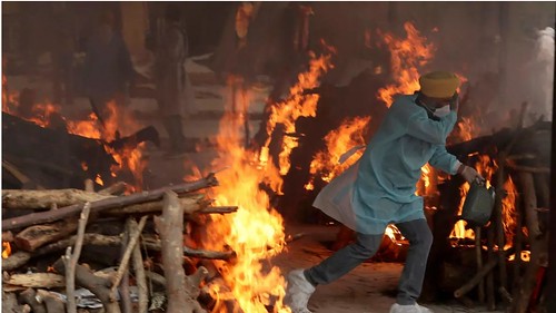 Một bên là lửa từ một tên lửa Trung Quốc cất cánh, một bên là lửa từ những giàn hỏa thiêu thi thể chết vì Covid-19 tại Ấn Độ. Bức ảnh ghép, được một trang web trực thuộc Đảng cộng sản Trung Quốc đăng trên mạng xã hội Weibo để kích động tinh thần dân tộc và so sánh thế ưu việt với nước láng giềng đang sống trong địa ngục Covid-19, lại gây phản cảm.