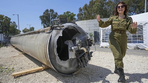 Trung úy Masha Michelson, phó giám đốc bộ phận báo chí quốc tế của quân đội Israel giới thiệu với truyền thông một trong những hỏa tiễn đạn đạo của Iran đã bị bắn hạ, tại căn cứ không quân Julis, miền nam Israel ngày 16/04/2024. AP - Tsafrir Abayov