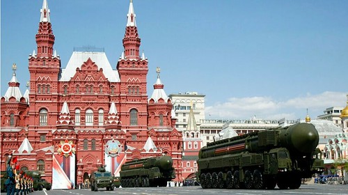 Tên lửa liên lục địa (ICBM) có khả năng mang đầu đạn hạt nhân của Nga tại lễ diễn binh kỷ niệm 71 năm chiến thắng phát xít trên Quảng trường Đỏ, Moskva, ngày 09/05/2016. AP - Alexander Zemlianichenko