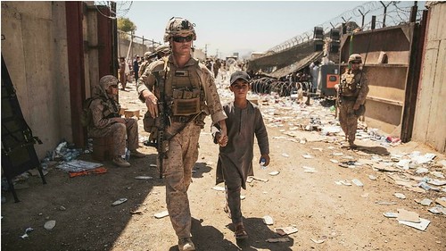 Một thủy quân lục chiến Mỹ hướng dẫn một trẻ em đến với gia đình trong cuộc di tản tại phi trường quốc tế Hamid Karzai ở Kabul, Afghanistan ngày 24/08/2021 via Reuters - US Marines