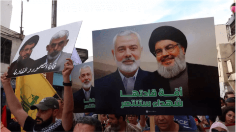 Người biểu tình ở Tunisia ngày 07/10/2024 mang ảnh Ismail Haniyeh, thủ lãnh nhánh chính trị của Hamas ; Hassan Nasrallah, thủ lãnh Hezbollah ; Yahya Sinwar, thủ lãnh Hamas. Cả ba đều đã bị Israel tiêu diệt. Reuters - Jihed Abidellaoui