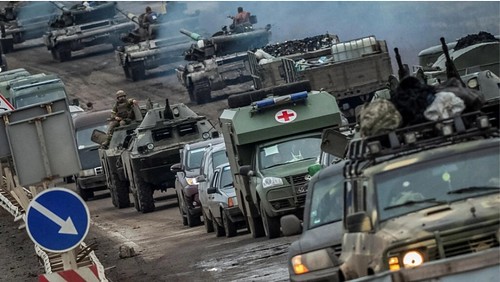 Đoàn xe tăng và xe quân sự Ukraine trên một con đường ở Kherson, trong lúc Nga tiếp tục các cuộc oanh kích sau khi rút khỏi thành phố. Ảnh chụp ngày 18/11/2022. Reuters -–Stringer