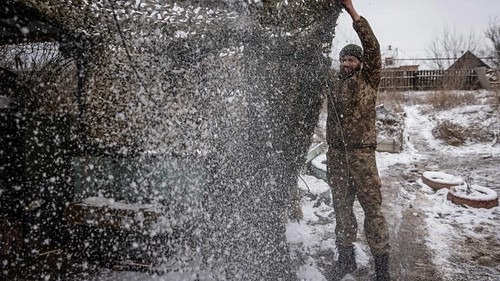 Một quân nhân Ukraine thuộc lữ đoàn cơ giới 93 rũ tuyết ra khỏi lưới ngụy trang ở gần tiền tuyến vùng Donetsk, ngày 25/12/2023. Reuters – Thomas Peter