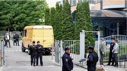 Các nhà điều tra bên ngoài một tòa nhà ở Moskva bị drone tấn công ngày 30/05/2023. Reuters – Maxim Shemetov
