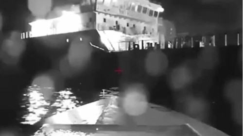 Ảnh cắt từ video ngày thứ Bảy 05/08/2023 cho thấy một drone hải chiến tiếp cận một tàu dầu của Nga ở Hắc Hải gần Crimea. Đây là cuộc tấn công thứ nhì trong ngày bằng drone biển của Ukraine, sau khi tập kích một cảng lớn của Nga. AP