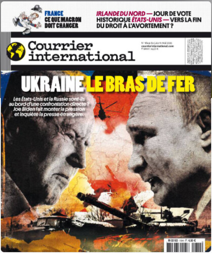 "Mỹ, Nga có nguy cơ đụng độ trực tiếp không" là chủ đề trang nhất của tuần san Courrier International, trên nền hình ảnh Biden và Putin, mặt giáp mặt, ở giữa hai lãnh đạo Mỹ, Nga là phi cơ, thiết giáp, xa tăng, tên lửa. Tuần san Courrier International đặc biệt chú ý đến phản ứng của tổng thống Nga, hứa hẹn sẽ đáp lại "các đe dọa không thể chấp nhận được về an ninh chiến lược" với các đòn trả đũa "nhanh chóng và kinh hoàng", "phản ứng của Nga sẽ là ngay lập tức và sẽ dẫn đến những hậu quả mà các vị chưa bao giờ phải hứng chịu trong lịch sử". Tuyên bố của lãnh đạo Nga Vladimir Putin hôm 27/04 trước Quốc hội Nga "làm lạnh sống lưng".