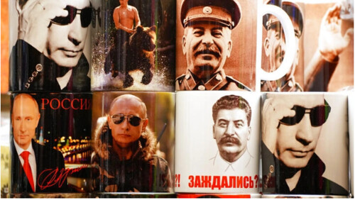 Những chiếc tách in hình tổng thống Nga Vladimir Putin và nhà độc tài Liên Xô Josef Stalin được trưng bày ở một gian hàng bán đồ kỷ niệm tại Saint Petersburg, Nga. Hình được chụp ngày 08/09/2021. AP - Dmitri Lovetsky