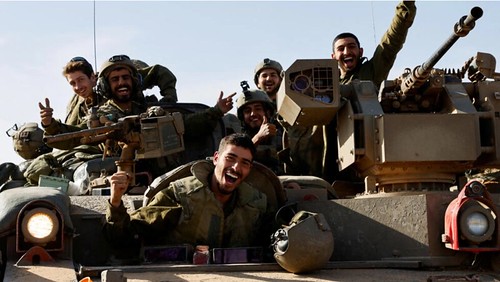 Các quân nhân Israel trên một xe quân sự rời khỏi Gaza trong thời gian hưu chiến với phe Hồi giáo Hamas, ngày 24/11/2023. Reuters – Amir Cohen