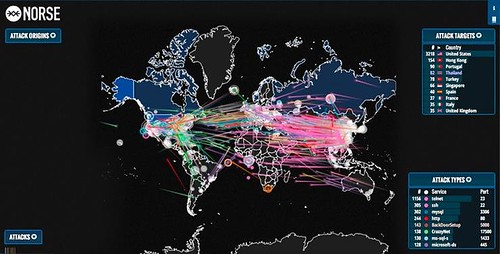 Hình minh họa chụp tháng 11/2015 từ trang Norse Attack Map cho thấy những cuộc tấn công thật đang diễn ra trên thế giới. Flickr.com