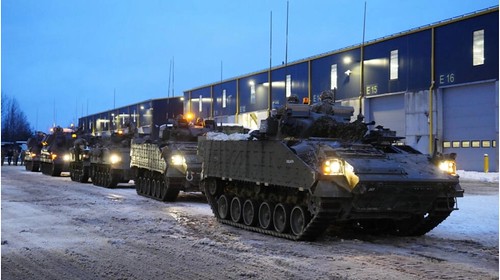 Các xe thiết giáp Anh tiến về căn cứ quân sự Tapa ở Estonia ngày 19/01/2023. Luân Đôn tuyên bố chi viện cho Ukraine ít nhất ba khẩu đội pháo AS-90, xe bọc thép, đạn dược, 600 hỏa tiễn Brimstone, một đại đội xe tăng Challenger 2. AP - Pavel Golovkin