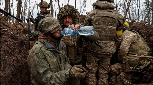 Một chiến sĩ Ukraine cho tù binh Nga uống nước, tại một vị trí vừa giành được gần thành phố Bakhmut, ngày 11/05/2023. via Reuters - RFE/RL/Serhiy Nuzhnenko