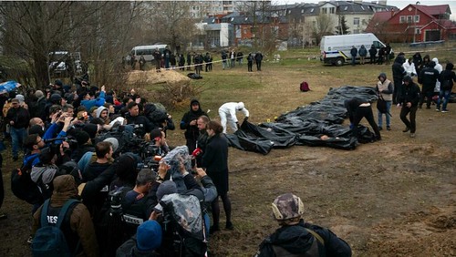 Phóng viên quốc tế làm nhiệm vụ khi Ukraine phát hiện xác thường dân bị thảm sát hàng loạt ở Bucha, ngày 08/04/2022. AP - Rodrigo Abd
