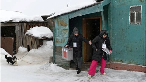 Nhân viên ủy ban bầu cử địa phương đem thùng phiếu đến nhà dân ở làng Novoaleksandrovka, vùng Omsk, Nga trong ngày bầu cử tổng thống 15/03/2024/Reuters - Alexey Malgavko