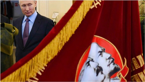 Tổng thống Nga Vladimir Putin đang ngắm một lá cờ phướn thời Liên Xô cũ với hình Lênin và Stalin. Ảnh chụp tại Ivanovo, đông bắc Moskva ngày 06/03/2020. AP - Alexei Nikolsky