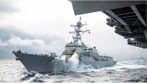 Khu trục hạm mang tên lửa dẫn đường USS John Finn (DDG 113) tiếp cận tàu sân bay USS Theodore Roosevelt (CVN 71) ngày 14/01/2021. Nhóm tác chiến tàu sân bay Theodore Roosevelt đã được phái trở lại Biển Đông ngay sau ngày ông Biden nhậm chức tổng thống Mỹ hôm 20/01/2021. USS Theodore Roosevelt (CVN 71) - Petty Officer 1st Class Christop