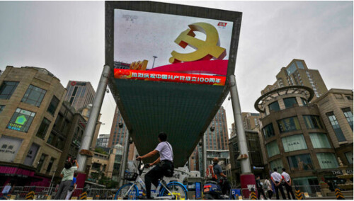 Màn hình lớn trước một trung tâm thương mại chiếu biểu tượng búa liềm tại Thiên An Môn nhân kỷ niệm 100 năm thành lập Đảng cộng sản Trung Quốc, ngày 01/07/2021. AP - Andy Wong