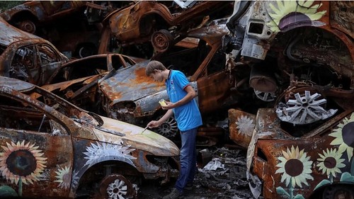 Nghệ sĩ Ukraine Viacheslav Rybka vẽ những đóa hoa hướng dương lên các xe bị phá hủy trong đợt tấn công của quân Nga ở Irpin, khu vực Kiev. Ảnh chụp ngày 10/08/2022. Reuters – Gleb Garanich