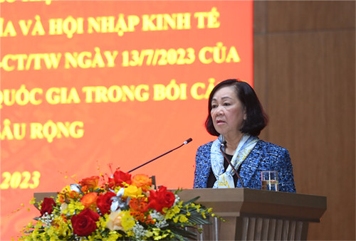 Bà Trương Thị Mai - Ủy viên Bộ Chính trị, Thường trực Ban Bí thư, Trưởng Ban Tổ chức Trung ương - chủ trì và chỉ đạo Hội nghị toàn quốc sơ kết 5 năm thực hiện Chỉ thị số 12-CT/TW ngày 5/1/2017 của Bộ Chính trị về tăng cường sự lãnh đạo của Đảng đối với công tác bảo đảm an ninh kinh tế