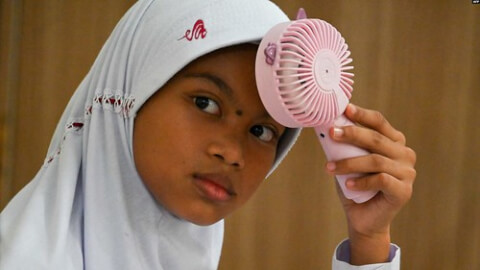 Một học sinh cầm chiếc quạt máy nhỏ để giảm nhiệt mùa hè, Aceh, Indonesia. Tháng 2/2024 tới, dân Indonesia sẽ đi bầu. Đây là lần đầu tiên các chức vụ tổng thống, đại biểu quốc hội sẽ được chọn trong một lần bỏ phiếu ; sau đó dân sẽ bầu thống đốc và nghị viện của 38 tỉnh.