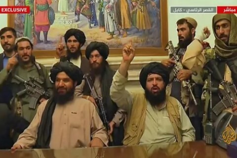 Những thủ lãnh Taliban chiếm Phủ Tổng thống và ngồi trên bàn làm việc của Tổng thống Afghanistan, Ashraf Ghani, bỏ chạy sang Tadjikistan tị nạn
