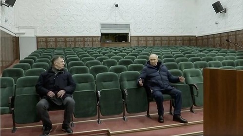 Tổng thống Nga Vladimir Putin và phó thủ tướng Marat Khousnoulline tại nhà hát Marioupol, ngày 19/03/2023. AP