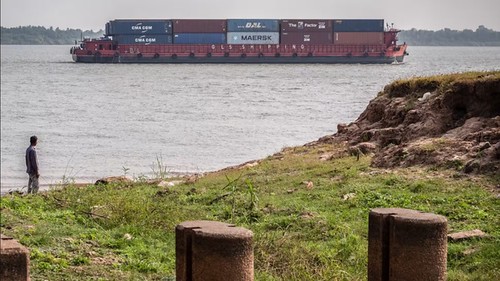 Một tàu vận chuyển container xuôi dòng sông Mekong. Thủ tướng Campuchia Hun Manet cho biết dự án kênh đào trị giá 1,7 tỷ USD do Trung Quốc tài trợ sẽ cho phép đất từ nội địa ra bờ biển của mình thay vì phải qua Đồng bằng sông Cửu Long do Việt Nam kiểm soát. (Ảnh của Jack Brook)