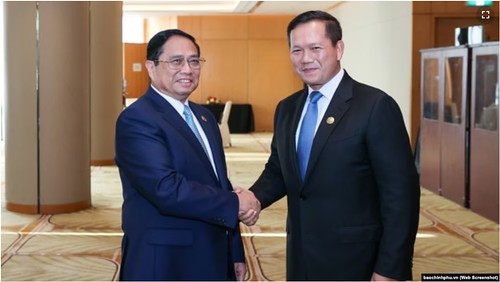 Thủ tướng Việt Nam Phạm Minh Chính bắt tay Thủ tướng Campuchia Hun Manet tại Hội nghị thượng đỉnh ASEAN ở Jakarta, Indonesia, vào ngày 5/9/2023. Ông Phạm Minh Chính cũng đã từng nêu vấn đề kênh đào Phù Nam Techo khi ông Hun Manet công du Việt Nam từ ngày 11-12/12/2023.