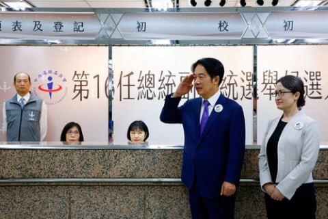 Phó Tổng thống Đài Loan Lại Thanh Đức và người đồng tranh cử Tiêu Mỹ Cầm sau khi đăng ký bầu cử tổng thống tại Ủy ban bầu cử trung ương ở Đài Bắc, Đài Loan ngày 21/11/2023. Reuters