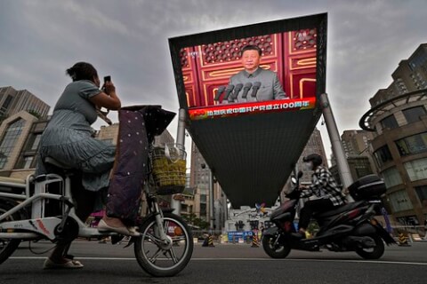 Một phụ nữ ghi lại những hình ảnh từ màn hình video lớn bên ngoài trung tâm mua sắm, quay cảnh Chủ tịch Trung Quốc Tập Cận Bình phát biểu trong sự kiện kỷ niệm 100 năm thành lập Đảng Cộng sản Trung Quốc tại Quảng trường Thiên An Môn ở Bắc Kinh năm 2021. Nền kinh tế Trung Quốc đang gặp khó khăn vì bảy lý do liên kết với nhau, phần lớn là do các chính sách của chính phủ và xu hướng thích kiểm soát của ông Tập. Andy Wong/AP