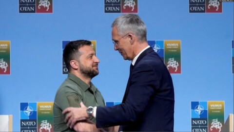 Tổng thống Ukraine, Volodymyr Zelenskiy, và ông Jens Stoltenberg, tổng thư ký khối NATO, tại Thượng Đỉnh NATO ở Vilnius, Lithuania.