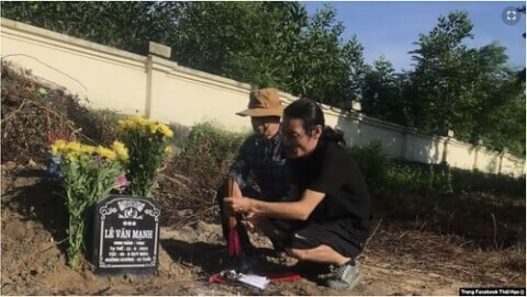 Facebooker Thái Hạo và anh Hoàng Tuấn Công bên mộ Lê Văn Mạnh.