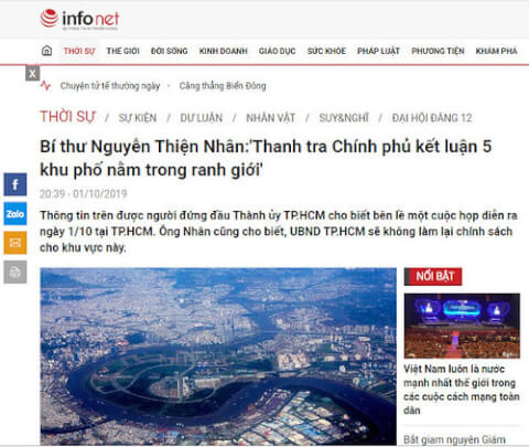 "Bí thư Nguyễn Thiện Nhân : 'Thanh tra Chính phủ kết luận 5 khu phố nằm trong ranh giới'" là tựa bài báo trên tờ Infonet, chuyên trang của báo điện tử Vietnamnet thuộc Bộ Thông tin và Truyền thông, phát hành lúc 20 :39 ngày 01/10/2019.