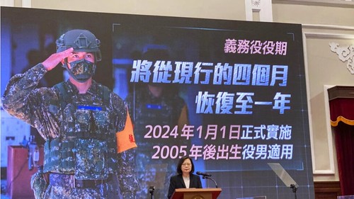 Do Trung Quốc không ngừng gia tăng đe dọa Đài Loan, ngày 27/12/2022, tổng thống Thái Anh Văn thông báo kéo dài thời gian nghĩa vụ quân sự từ 4 tháng lên thành 1 năm. Quyết định có hiệu lực từ năm 2024.