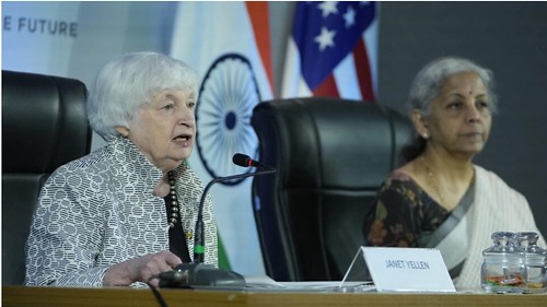Bộ trưởng Tài Chính Hoa Kỳ Janet Yellen (trái) và bộ trưởng Tài chính Ấn Độ Nirmala Sitharaman phát biểu trước truyền thông, bên lề hội nghị G20, tại Gandhinagar, Ấn Độ, ngày 17/07/2023. AP - Ajit Solanki