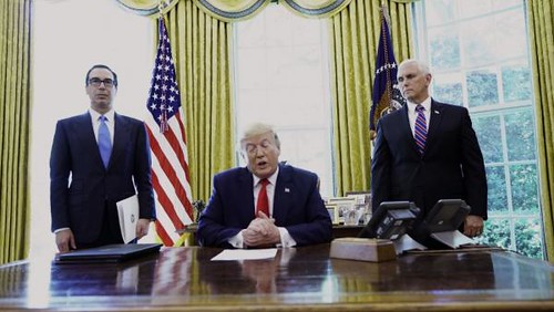 Tổng thống Mỹ Donald Trump cùng với phó tổng thống Mike Pence(P) và bộ trưởng tài chính Steven Mnuchin tại Nhà Trắng ngày 24/06/2019, trước khi ký sắc lệnh trừng phạt lãnh đạo tinh thần tối cao của Iran… MANDEL NGAN / AFP
