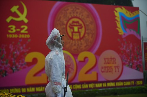 Một cảnh sát đứng trước tấm áp phích kỷ niệm 90 năm Đảng cộng sản Việt Nam tại Hà Nội vào ngày 3 tháng 2 năm 2020. AFP