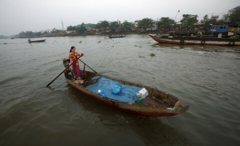Người bán trái cây trên thuyền green sông Mekong ở Cần Thơ hôm 2/4/2016 Reuters