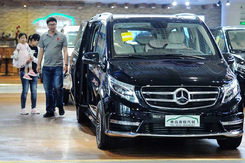 Nước Đức xuất cảng rất nhiều xe hơi. Trong 12 tháng qua ở nước Tàu số xe bán giảm bớt 12%. Bắc Kinh đã hạn chế không để các ngân hàng vung tiền cho vay nữa, Đức chịu ảnh hưởng nặng nề, một nguyên nhân khiến kinh tế Đức tụt giảm. Trong hình, xe hơi nhập cảng của Mercedes-Benz tại một phòng trưng bày ở Thanh Đảo, phía Đông tỉnh Sơn Đông, Trung Quốc. (Hình : STR/AFP/Getty Images)
