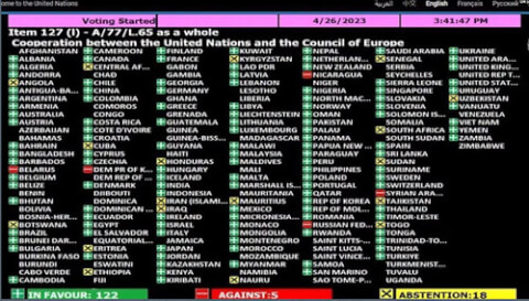 Ngày 26/4, một cách bất ngờ, Việt Nam và Trung Quốc đã bỏ phiếu ủng hộ một Nghị quyết mới của Liên Hợp Quốc, trong đó có đoạn nói về "cuộc xâm lược quân sự" của Nga đối với Ukraine. Nghị quyết, do 48 quốc gia đề xuất, khuyến khích Liên Hiệp Quốc và Hội đồng Châu Âu tăng cường hợp tác ở tất cả các cấp để giải quyết hiệu quả nhiều chủ đề. Trong phần về Ukraine, có đoạn viết về "những thách thức chưa từng có mà Châu Âu phải đối mặt, sau hành động gây hấn quá khích của Nga đối với Ukraine và Georgia (Gruzia)". Nataliya Zhynkina, Tham tán Chính trị Ukraine tại Việt Nam bình luận với truyền thông quốc tế về cuộc bỏ phiếu mới nhất này : "Chúng tôi hoan nghênh sự đoàn kết trong việc xác định hành vi xâm lược của Nga đối với Ukraine và Georgia (Gruzia) cùng những thách thức mà hành động đó gây ra đối với hòa bình và an ninh toàn cầu. Điều quan trọng là phải hiểu lý do của một vấn đề để tìm giải pháp thích hợp". Nghị quyết A/RES/77/284 được thông qua với 122 phiếu thuận, 18 nước bỏ phiếu trắng và 5 nước bỏ phiếu chống. Lần đầu tiên, tất cả các nước ASEAN đã bỏ phiếu nhất trí ủng hộ Nghị quyết liên quan đến cuộc xung đột diễn ra ở Ukraine. Khối này từng bị chỉ trích gây chia rẽ, qua vấn đề Biển Đông, cuộc chiến thương mại giữa Mỹ và Trung Quốc, cuộc đảo chính ở Myanmar và gần đây nhất là cuộc xâm lược của Nga đối với Ukraine. Đây cũng là lần đầu tiên Trung Quốc và Việt Nam cùng theo phe đa số ủng hộ một Nghị quyết của Liên Hiệp Quốc nêu rõ hành động "xâm lược của Nga ở Ukraine và Georgia (Gruzia) trước đây". Báo chí nhà nước Việt Nam từ lâu vẫn gọi cuộc xâm lược của Nga là "chiến dịch quân sự đặc biệt", giống hệt như cách mà truyền thông Nga và Trung Quốc sử dụng, trong khi đối với các nước phương Tây, đây thực sự là cuộc xâm lược vào một quốc gia có chủ quyền, có cương vực và lãnh thổ được quốc tế thừa nhận.