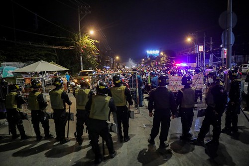Công an đứng chặn tại một chốt ở TPHCM đêm 30/9/2021 khi người lao động bắt đầu dời thành phố trước khi lệnh phong toả được dỡ bỏ vào sáng ngày 1/10/2021 Reuters