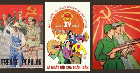 Tranh tuyên truyền của Mặt trận Bình dân tại Tây Ban Nha năm 1936 (trái), Mặt trận Dân tộc Giải phóng miền Nam Việt Nam năm 1960 (phải) và Mặt trận Tổ quốc Việt Nam năm 2021 (giữa). Ảnh : Nhiều nguồn.