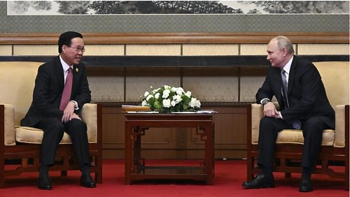 Tổng thống Nga Vladimir Putin và chủ tịch nước của Việt Nam Võ Văn Thưởng gặp nhau bên lề Diễn đàn Vành đai và Con đường ngày 17/10/2023 tại Bắc Kinh, Trung Quốc. AP - Grigory Sysoyev